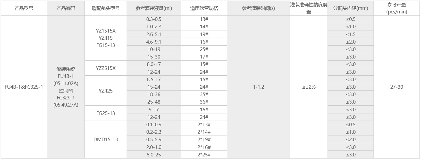 | 通道數(shù)量 | 4(單組灌裝系統(tǒng)FU4B-1)~32(8組灌裝系統(tǒng)FU4B-1) |