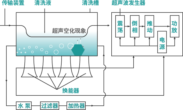 通過換能器,將功率超聲頻源的聲能轉(zhuǎn)換成機(jī)械振動(dòng),通過清洗槽壁將超聲波輻射到槽子中的清洗液。由于受到超聲波的輻射,槽內(nèi)液體中的微氣泡能夠在聲波的作用下快速變大破裂,破裂時(shí)產(chǎn)生的高強(qiáng)度剪切力作用于各類樣品上,從而達(dá)到清洗、提取、乳化、加速溶解、粉碎、分散等作用。