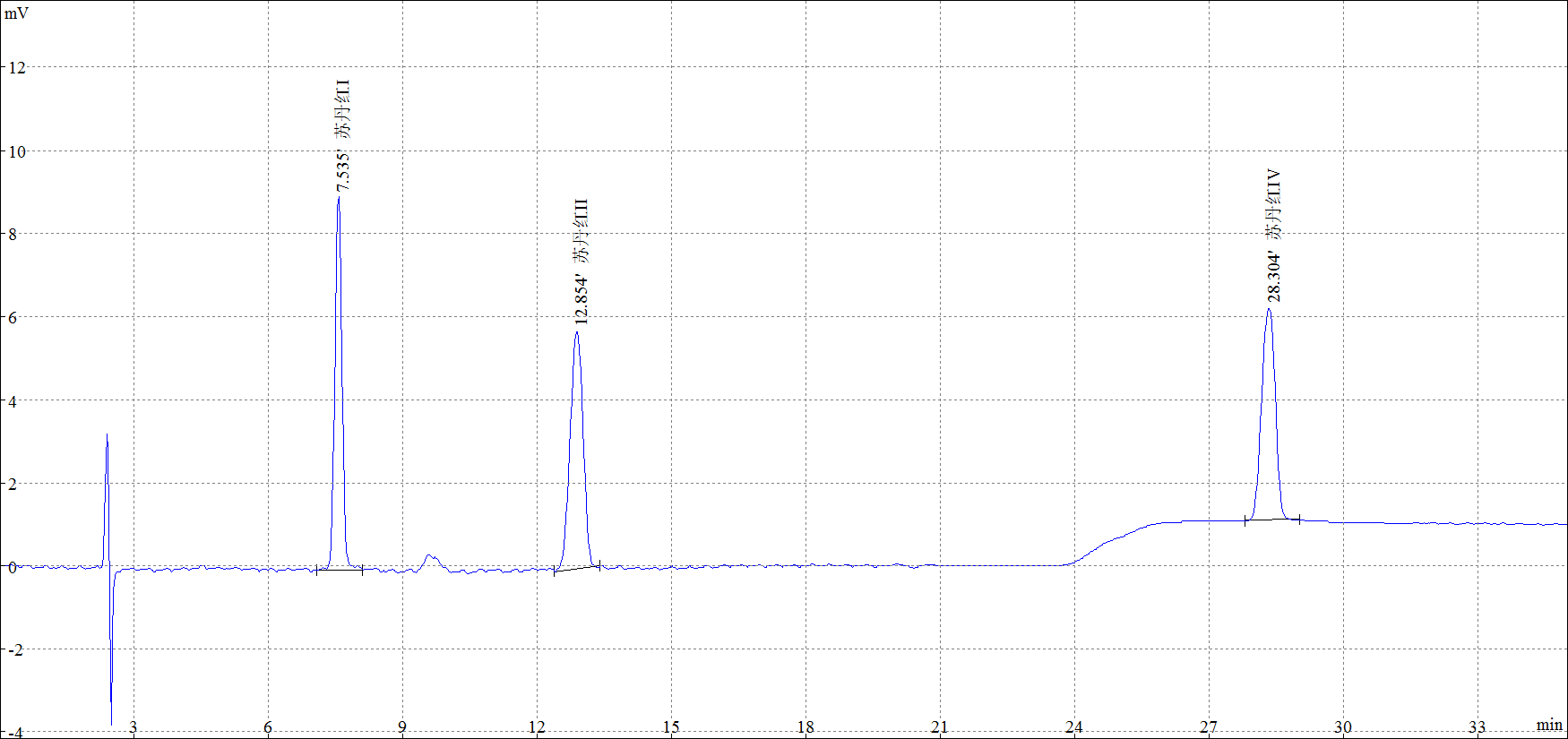 2.5 μg/mL 蘇丹紅I、蘇丹紅II、蘇丹紅IV混合標(biāo)準(zhǔn)樣品