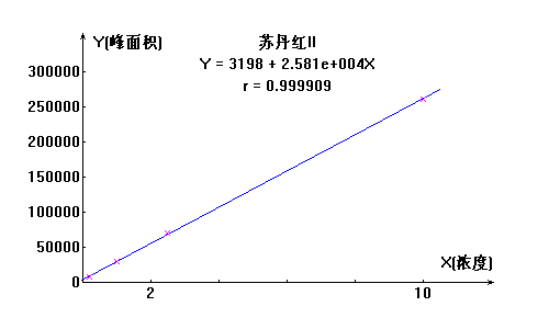 蘇丹紅I號(hào)工作曲線見(jiàn)下圖,線性相關(guān)系數(shù):0.9997