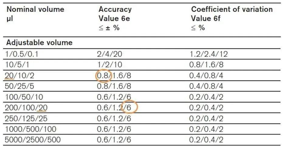 移液操作通常為反向移液,對于低濃度樣本盡可能增加重復(fù)以防止低分子隨機(jī)性因素導(dǎo)致結(jié)果不穩(wěn)定,高濃度探針引物稀釋后移液可以減少批間誤差。以手動(dòng)單道移液器為例(如圖5),同樣是移取20 μl液體,選擇量程是20 μl的移液器時(shí)精度≤±0.8%,換算成體積為±0.16μl;而選擇量程是200μ的移液器時(shí)精度為≤±6%,體積偏差在±1.2μl 。