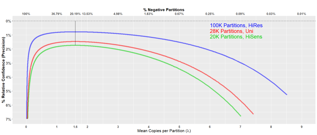 分散過程中的誤差分析:統(tǒng)計(jì)學(xué)樣本濃度均值λ,即平均一個(gè)分區(qū)單元包含λ個(gè)拷貝不一定剛好是真實(shí)模板濃度,需要結(jié)合置信區(qū)間和置信水平表示,數(shù)字PCR中置信水平通常是95%,而針對置信區(qū)間科研和商業(yè)化公司有多種計(jì)算方式。